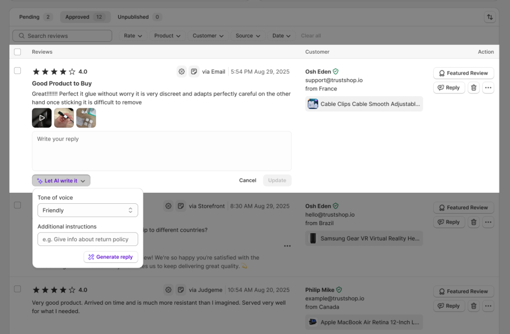 • Context-aware: AI analyzes review content, product details, and review media to create the most relevant response.