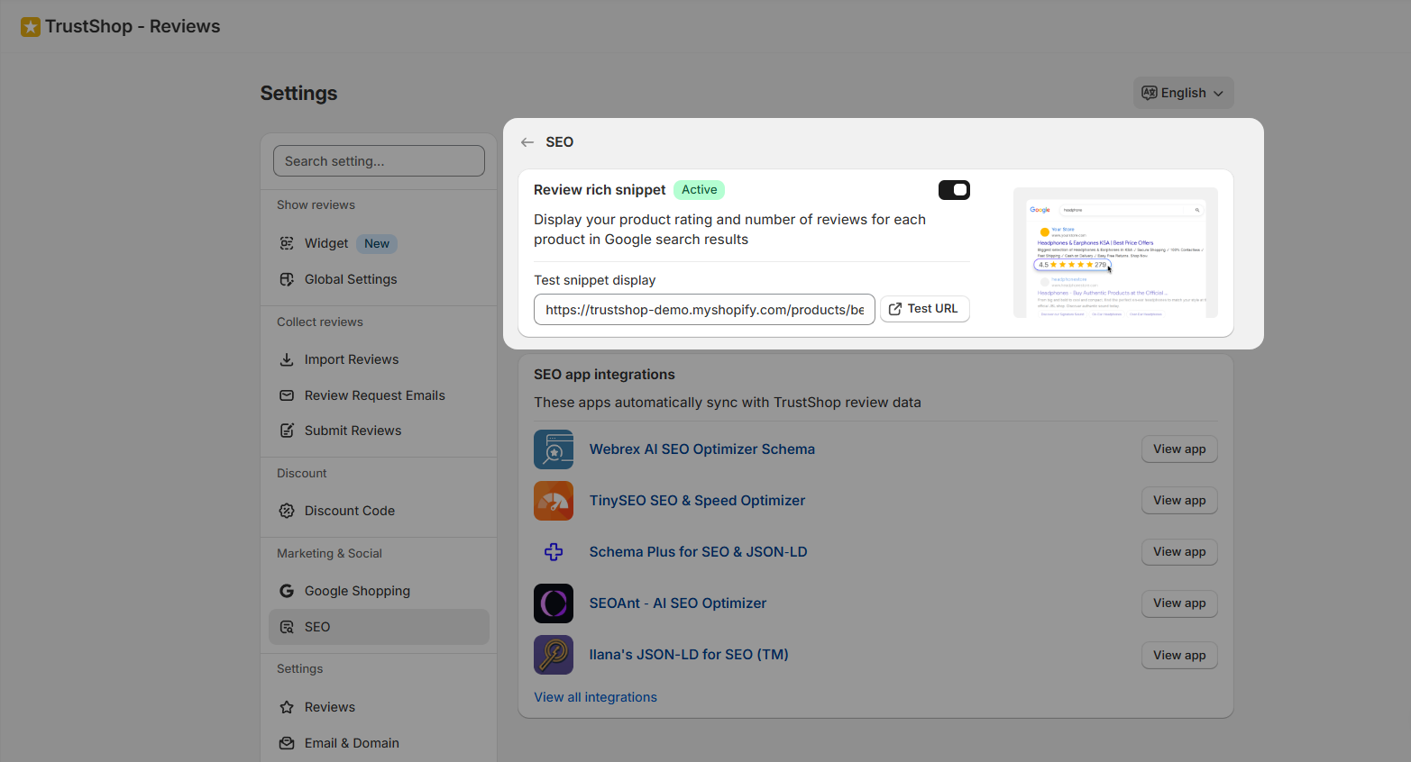 In TrustShop, go to Settings → Marketing & Social → SEO and toggle on the Review rich snippet feature. That’s it — TrustShop will automatically inject the correct Product and AggregateRating schema into your product pages.