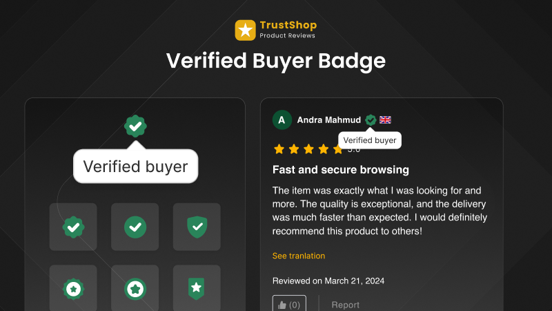 Build even more credibility with the new Verified Buyer badge feature. This trust signal helps your customers identify reviews from confirmed purchasers, increasing confidence in your products and your store.