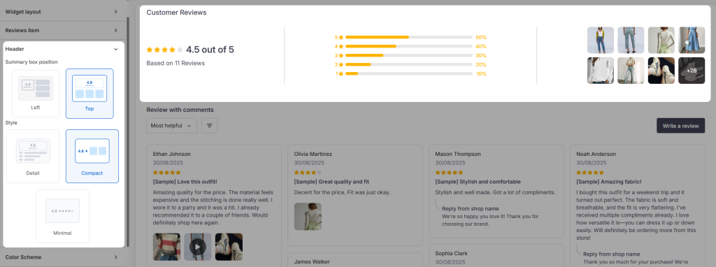 • Summary Box: Choose from Detail, Minimal, or Compact to display your overall rating in the way that best suits your storefront.