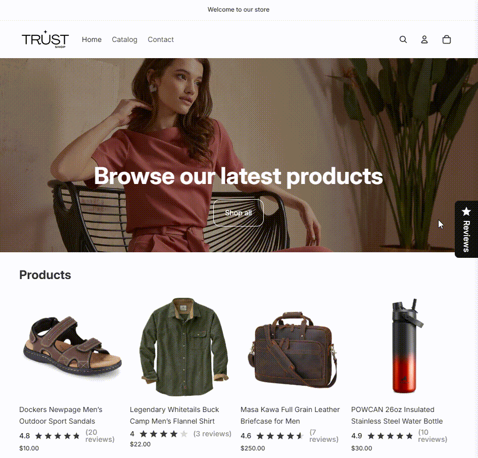 Review Sidebar is a floating tab that stays visible on the edge of your storefront. When clicked, it opens a review modal so visitors can read reviews without leaving the page they’re on.