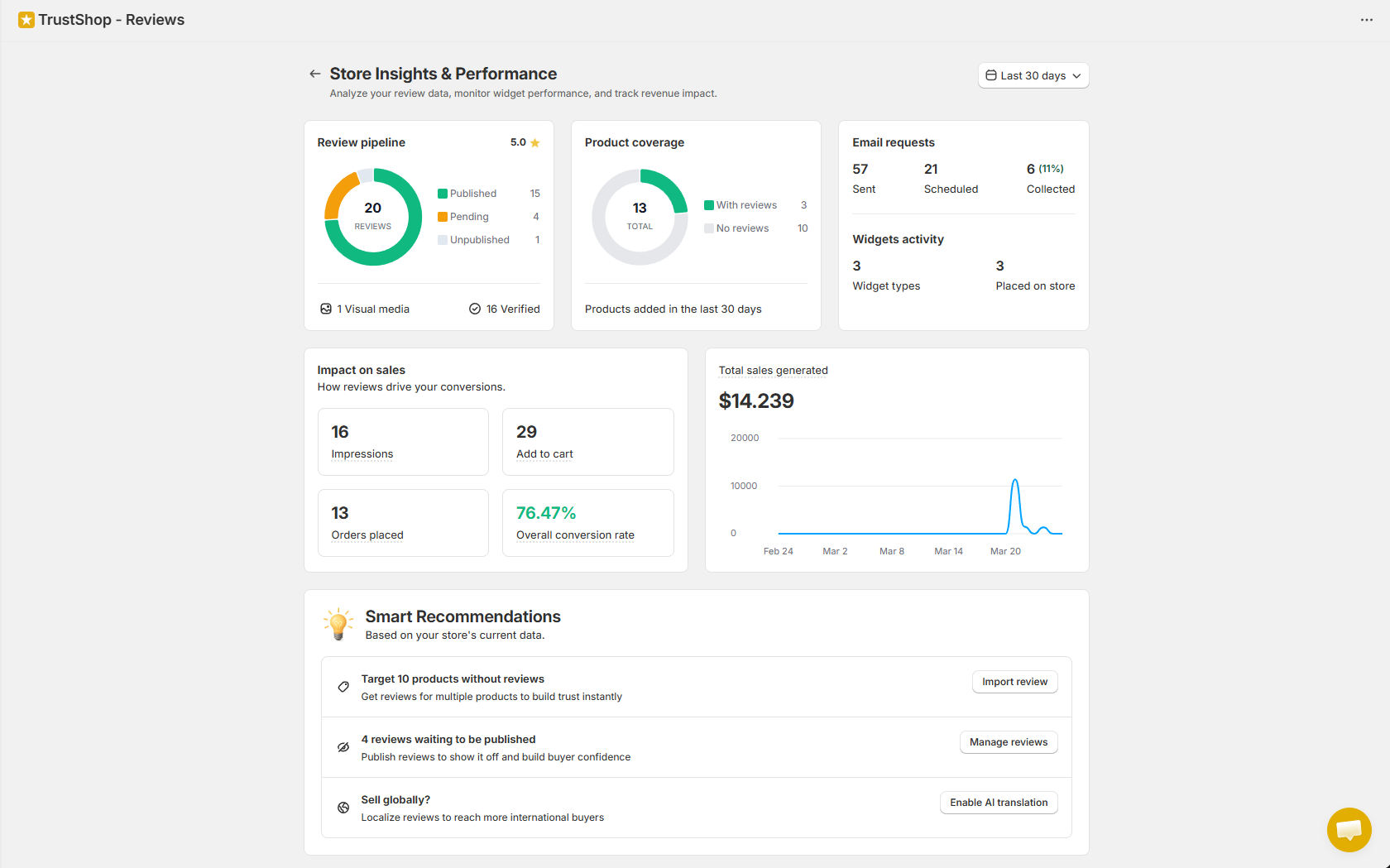 It’s been difficult to see whether reviews actually drive sales. The new dashboard tracks the full funnel — from a customer viewing a review widget to placing an order — so you can measure revenue impact and know where to act.