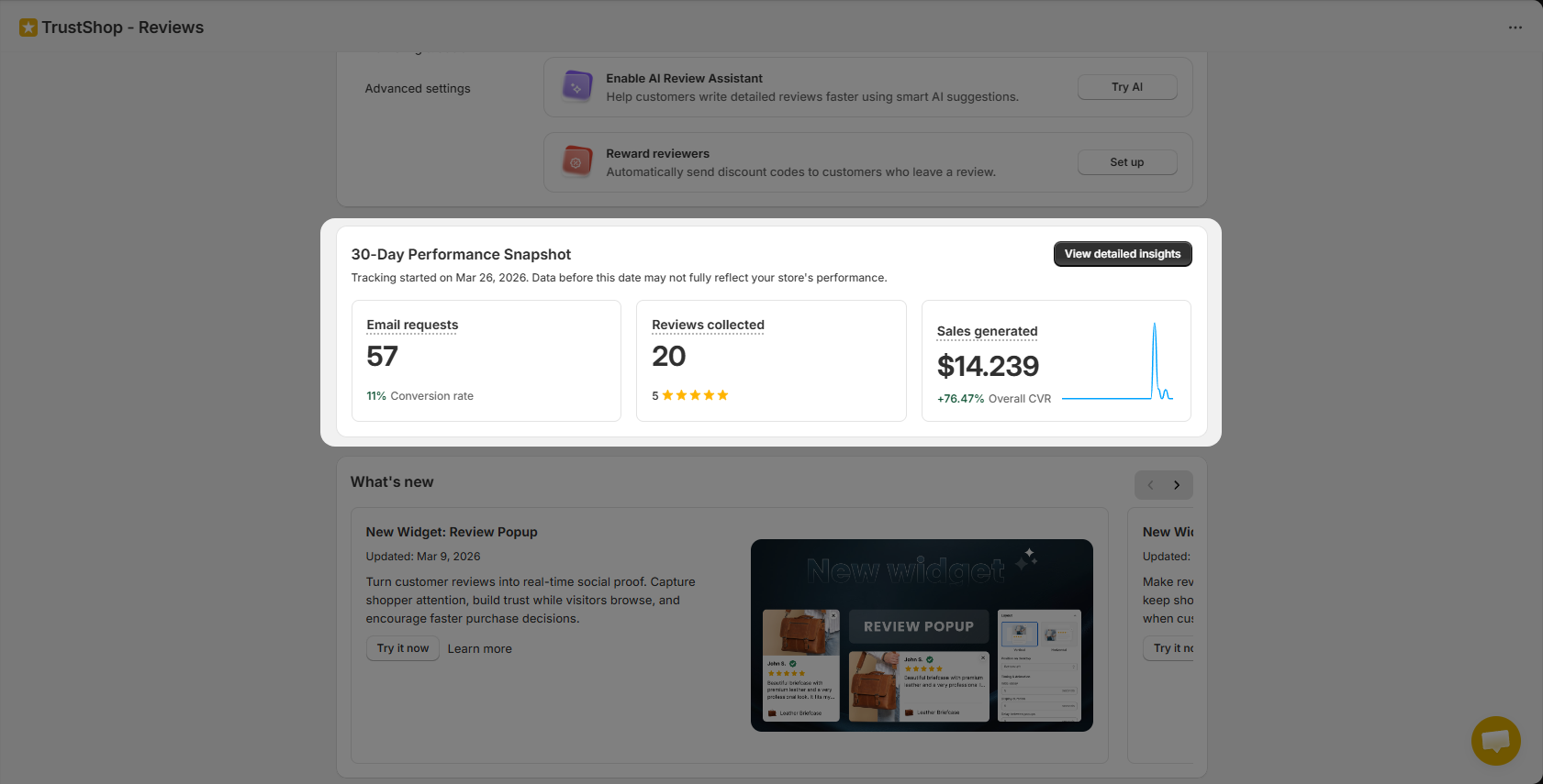 TrustShop 4.4 introduces the Review Performance Dashboard — a new analytics view that shows how your reviews engage customers, influence purchases, and generate revenue.
