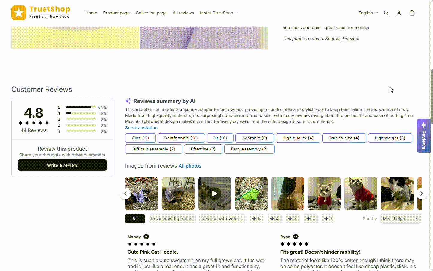 Alongside summaries, TrustShop generates smart tags — labels like “material,” “fit,” “durability,” “shipping speed” — that let shoppers filter reviews by the topics they care about most. Instead of reading every review, a customer wondering about sizing can tap the “fit” tag and instantly see relevant reviews.